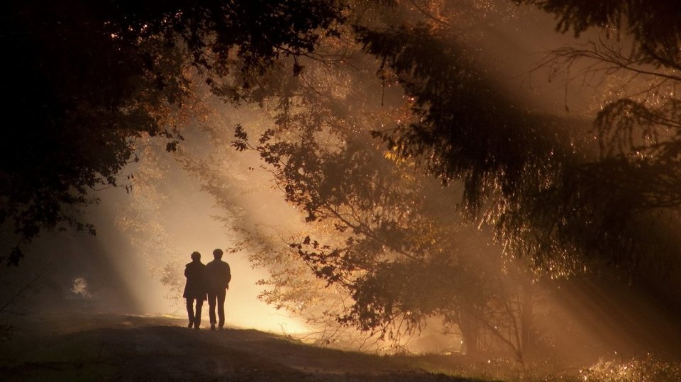 couple walking into sunshine
